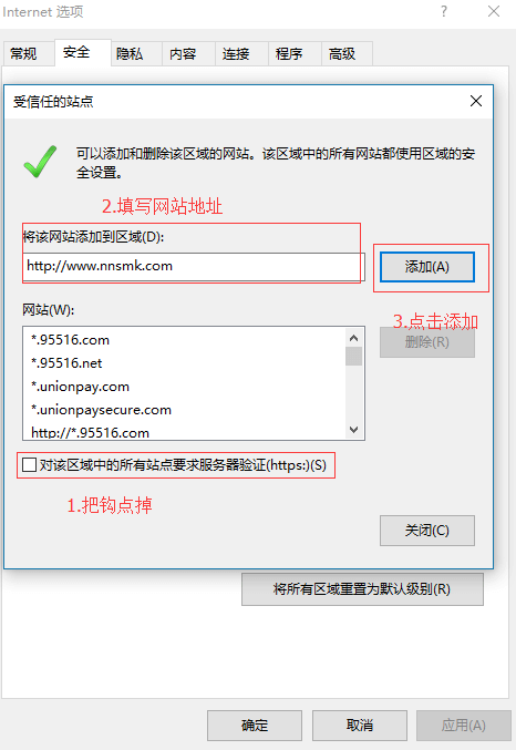 3.进入可信站点设置界面。首先将“对该区域中的所有站点要求服务器验证(https:)(s)”去掉勾选,在到“将该网站添加到区域(D)”处输入你要添加为信任站点的网址,最后点击添加按钮即可。然后关闭所有窗口