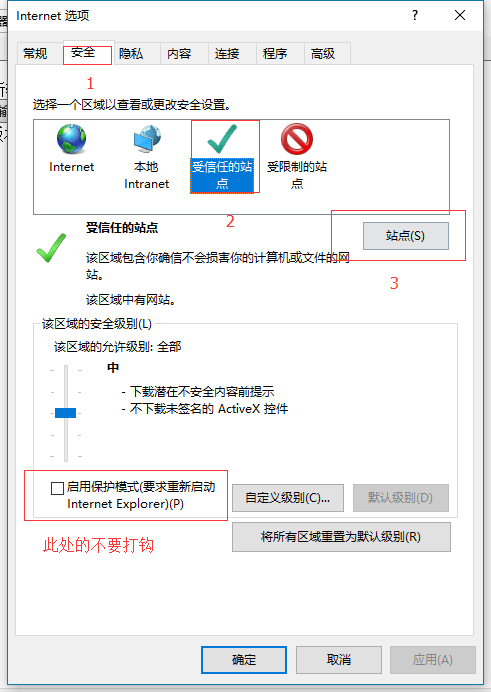 2.进入到“Internet 选项”设置框后,依次点击“安全”——“可信站点”——“站点”,如下图: